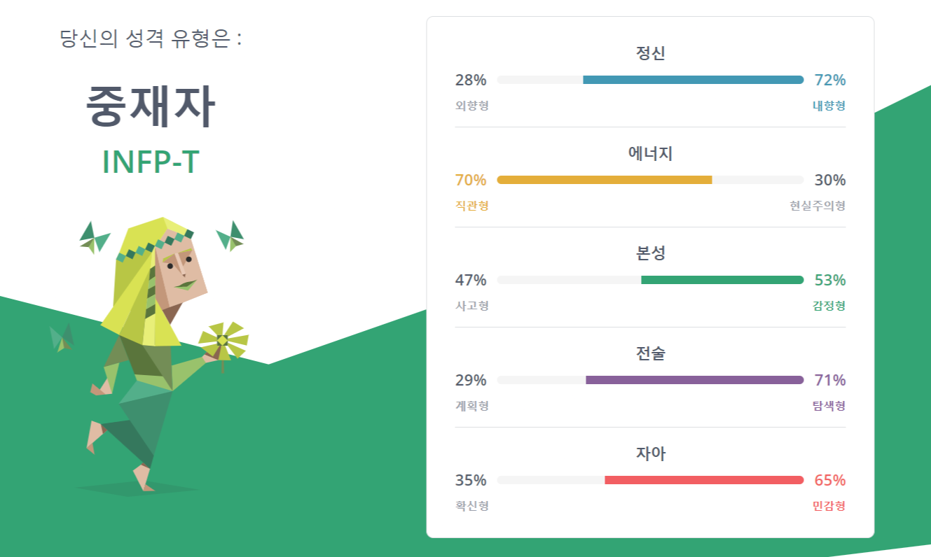 요즘 무료해서, 검사비가 무료라서, 온라인 MBTI 검사를 해보았다. 검사 결과는 중재자(INFP-T).